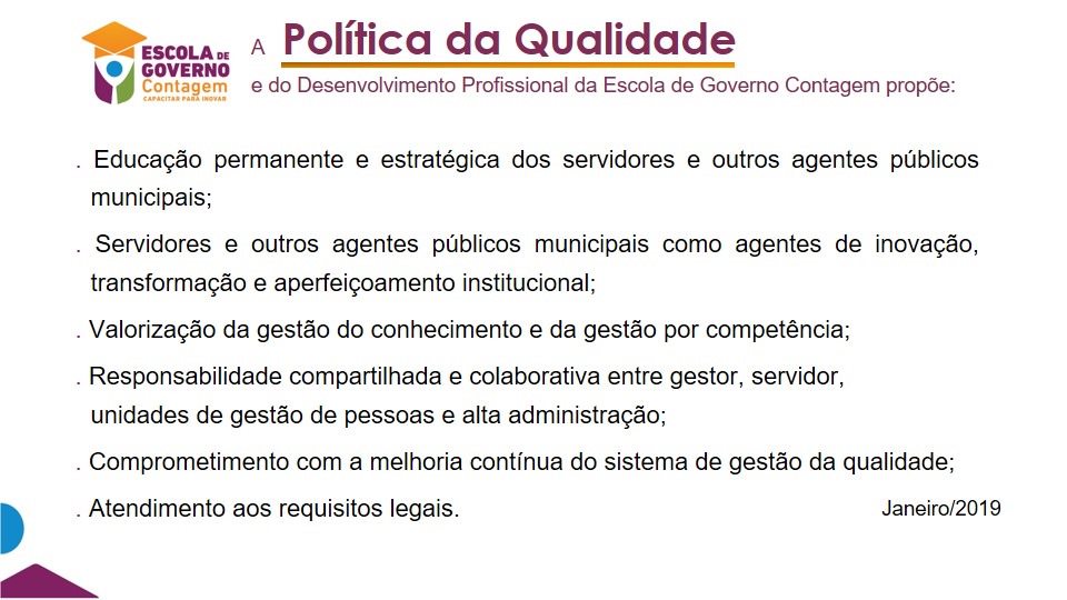 A implementação do Sistema de Gestão de Qualidade (SGQ) na Escola de Governo Contagem, instituída na implantação da EGC, estabelece organização, administração e controle no desenvolvimento dos processos e procedimentos de trabalhos, dos produtos e serviços ofertados, com o objetivo de garantir a qualidade, a melhoria contínua e alcance dos resultados esperados.